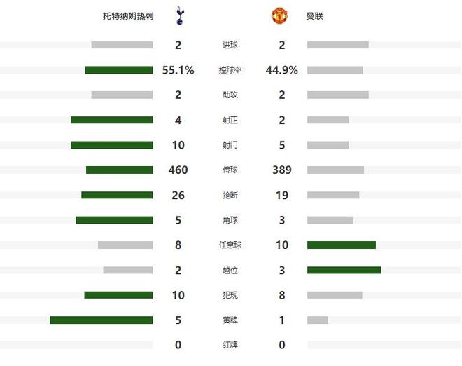第62分鐘熱刺中場搶斷后,第一時間推反擊,約翰遜雖然單刀破門,但越位在先導致進球被取消,狂攻不止的熱刺,終于在第84分鐘扳平比分,替補登場的特爾,禁區內轉身抽射讓拉門斯無可奈何,將比分追至1平,起勢的熱刺在傷停補時第91分鐘反超比分,奧多貝爾大禁區外開炮,理查利森頭球一蹭,將比分改寫為了2-1,但曼聯也沒有放棄,德利赫特最后時刻的絕平進球,將比分定格為了2-2。